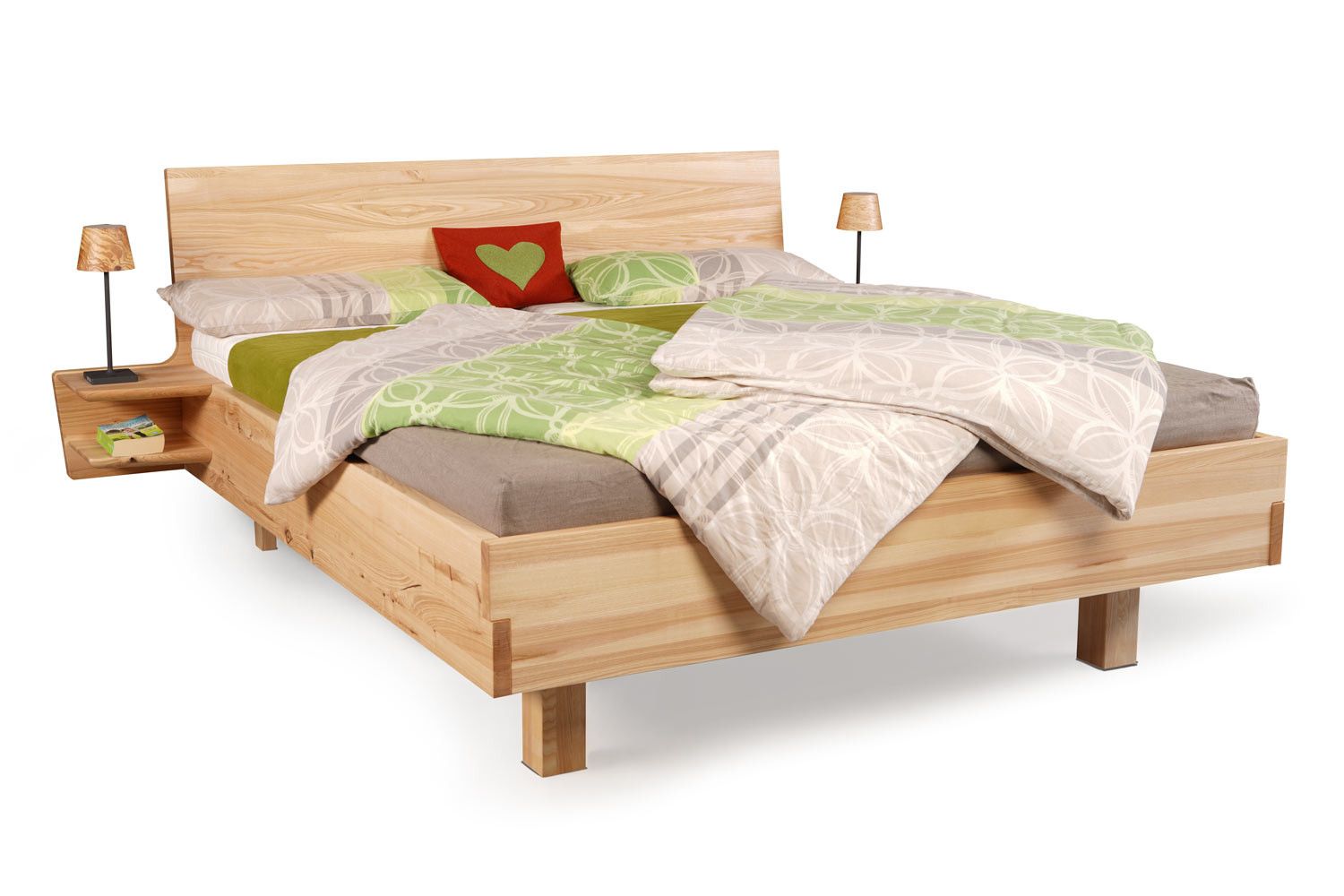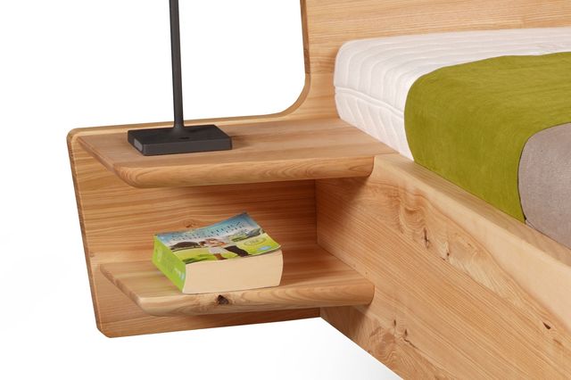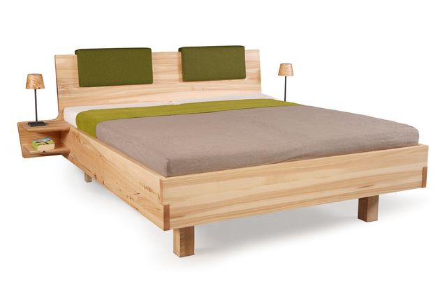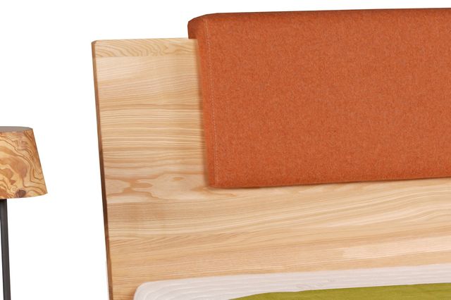 Unser Massivholzbett Kraftwerk, zeichnet sich durch die schöne einfache Eckverbindung des Fußteils aus. Das Kopfteil ist gradlinig und weißt eine 7° schräge auf. Hier können Polsterteile wahlweise eingehangen werden. Diese sind mit Lodenstoff und Naturkautschuk gepolstert. Die Doppelablage bietet genügend platz. Hier können Sie auch eine Einzel Ablage oder eine mit Schublade wählen.